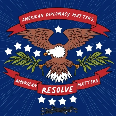 Illustrated gif. Eagle grasping olive branches bobs among stars with arrows piled beneath on a navy blue background. Text on red banners, "American diplomacy matters. American resolve matters."See more biden GIFs