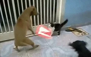 GIPHYVideo gif. A video of a cat in a fight with two dogs jumps around. The cat lunges at one of the dogs, rearing up and pouncing. The video has been edited so that the cat duels with two lightsabers. See more cat GIFs